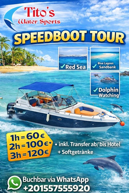 Speedboat with 2 motors π€ Speedboat Tour with Titoβs Water Sports πExperience the Red Sea in complete privacy on a modern speedboat (2 engines) β speed, freedom & breathtaking scenery included!``` π Prices (per boat):* 1 hour: β¬60* 2 hours: β¬100* 3 hours: β¬120β¨ The best part:You decide how your tour should be:βοΈ Relaxing cruise on the Red SeaβοΈ SnorkelingβοΈ Sandbank island visitβοΈ Or, with a little luck, spotting dolphins π¬β Included:βοΈ Transfer to/from your hotelβοΈ Soft drinks on boardπ² Book easily via WhatsApp:π +201557555920Perfect for couples, families, or friends β exclusive, flexible & unforgettable π΄π