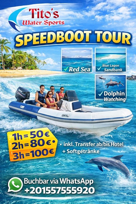 speedbooat tour with 1 motor π€π SPEEDBOAT TOUR β Your private boat tour, just the way you want it! ππ€Experience the Red Sea on a modern speedboat (1 engine) and customize your excursion to your liking π¬βοΈπΉ Options β choose from:βοΈ Relaxing cruise on the Red SeaβοΈ Visit to White IslandβοΈ Dolphin sightings (with a bit of luck) π¬βοΈ Snorkelingβ±οΈ Prices:* 1 hour β β¬50* 2 hours β β¬80* 3 hours β β¬100β Includes transfer to/from your hotelπ₯€ Soft drinks includedπ² Book easily via WhatsApp:π +201557555920Perfect for couples, families, or friends β private, flexible & unforgettable πBook your dream tour now!#TitosWaterSports #Speedboat #Boattour #RedSea #BlueLagoon #Dolphins #Hurghada #WhatsAppBooking