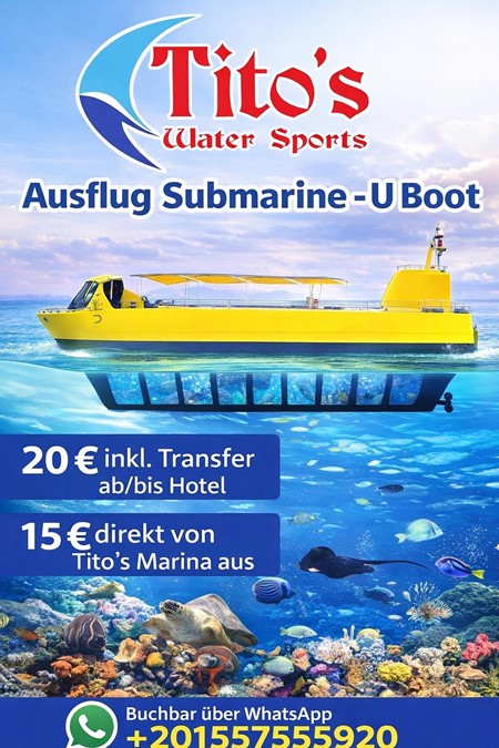 Submarine ππ€ Submarine Excursion β Submarine Experience in the Red Sea π π’Discover the fascinating underwater world in comfort and comfort aboard our submarine! (1.5 hours)Observe colorful corals, exotic fish, and life beneath the surface β a highlight for children and adults alike π¨βπ©βπ§βπ¦β¨πΆ Prices:πΉ β¬15 including transfer to/from your hotelπΉ β¬10 directly from Titoβs Marinaπ Ideal for families, non-divers, and anyone who wants to experience the Red Sea up close.π² Book now via WhatsApp:π +201557555920Spaces are limited β secure your underwater adventure today! ππ#submarine #hurghada #excursion #submarine #snorkelling
