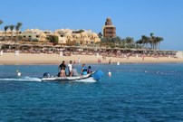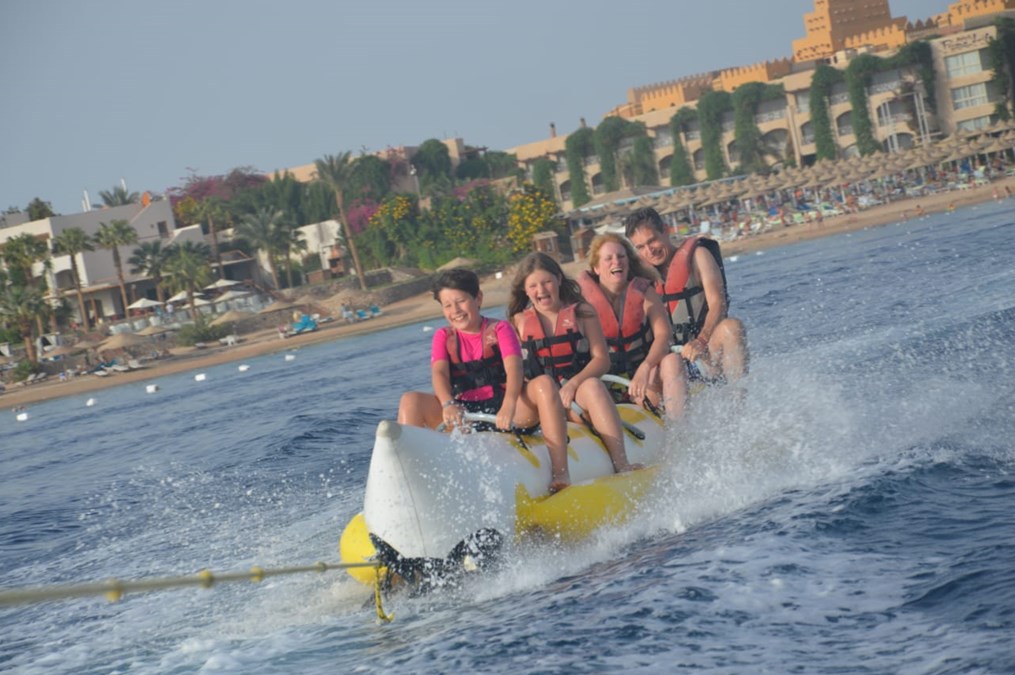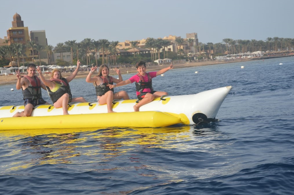 Banana Eine lustige und aufregende Aktivität für Gruppen. Ein Banana - Boot kann bis zu acht Personen aufnehmen. Das Boot wird, befestigt an einem Motorboot, an der Red Sea Küste entlangezogenen.